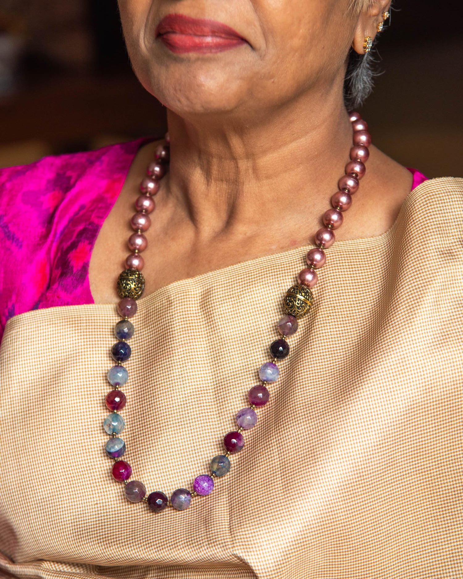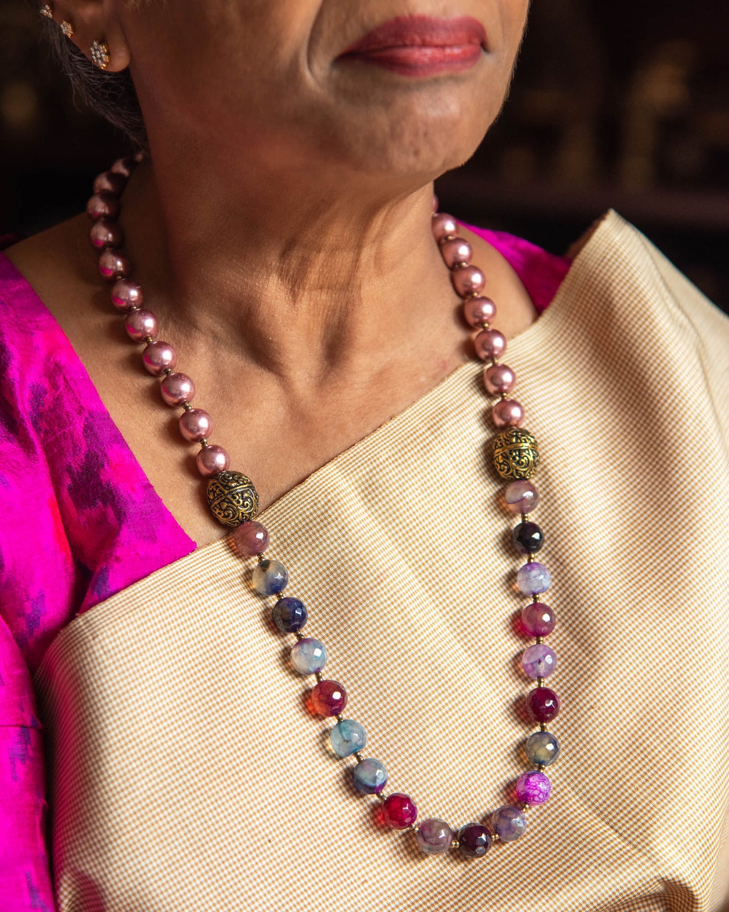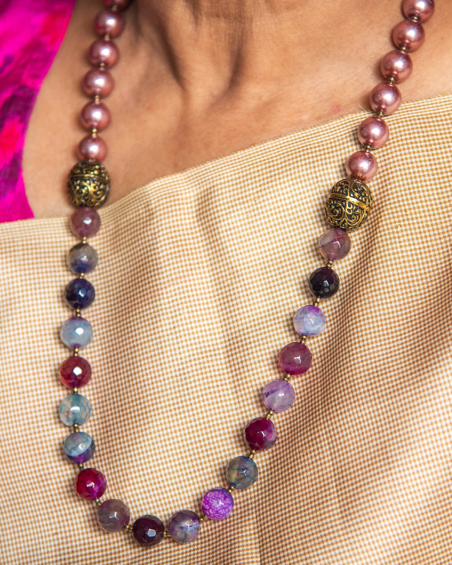 Agate Beads and shell pearls are divided by floral separators to form this unique neckpiece. Modern in design, this stunner is edgy with a dash of finesse; sure to turn heads at a brunch or at work! It is truly an Umang signature. Falls at 18"