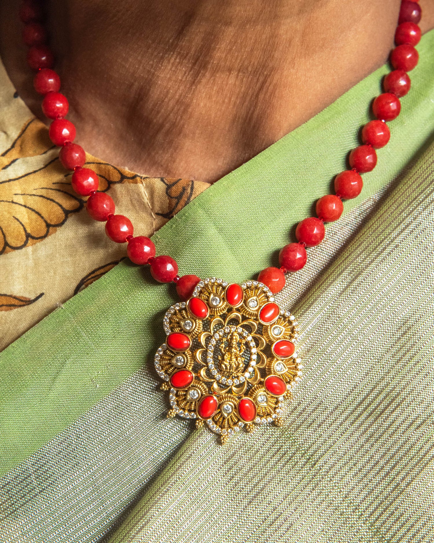 Umang Signature's Divine Antiques collection presents a masterfully crafted portrayal of the sacred Goddess Lakshmi. This exquisite piece captures the essence of Hindu mythology with refined artistry, making it an ideal companion to traditional Indian attire. The intricate detailing and timeless design also transcend cultural boundaries, seamlessly complementing contemporary and edgy styling.
